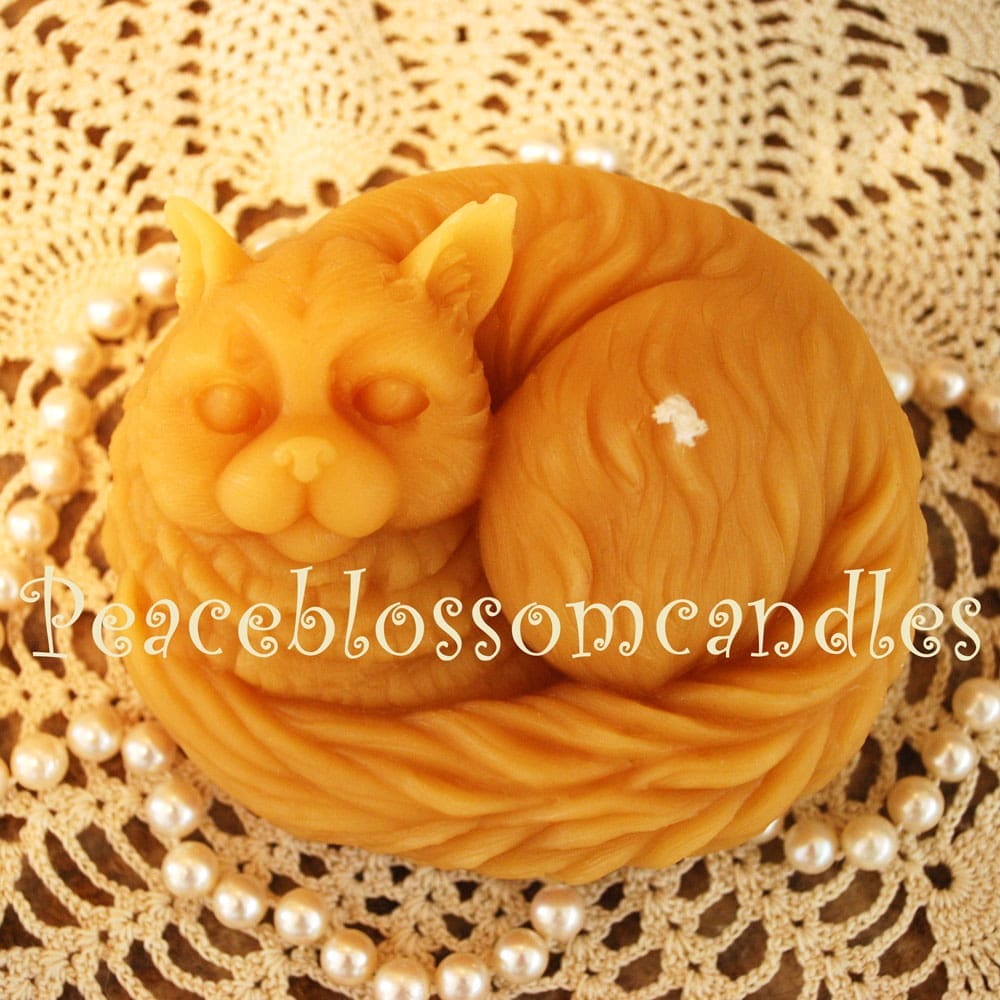 All curled up and ready for a nap, this kitty is made of wonderful-smelling pure Oregon Beeswax and fitted with an all-cotton wick. She measures 4″ long by 3 1/2″ wide and 2″ tall. Burn time: approximately 20 hours.