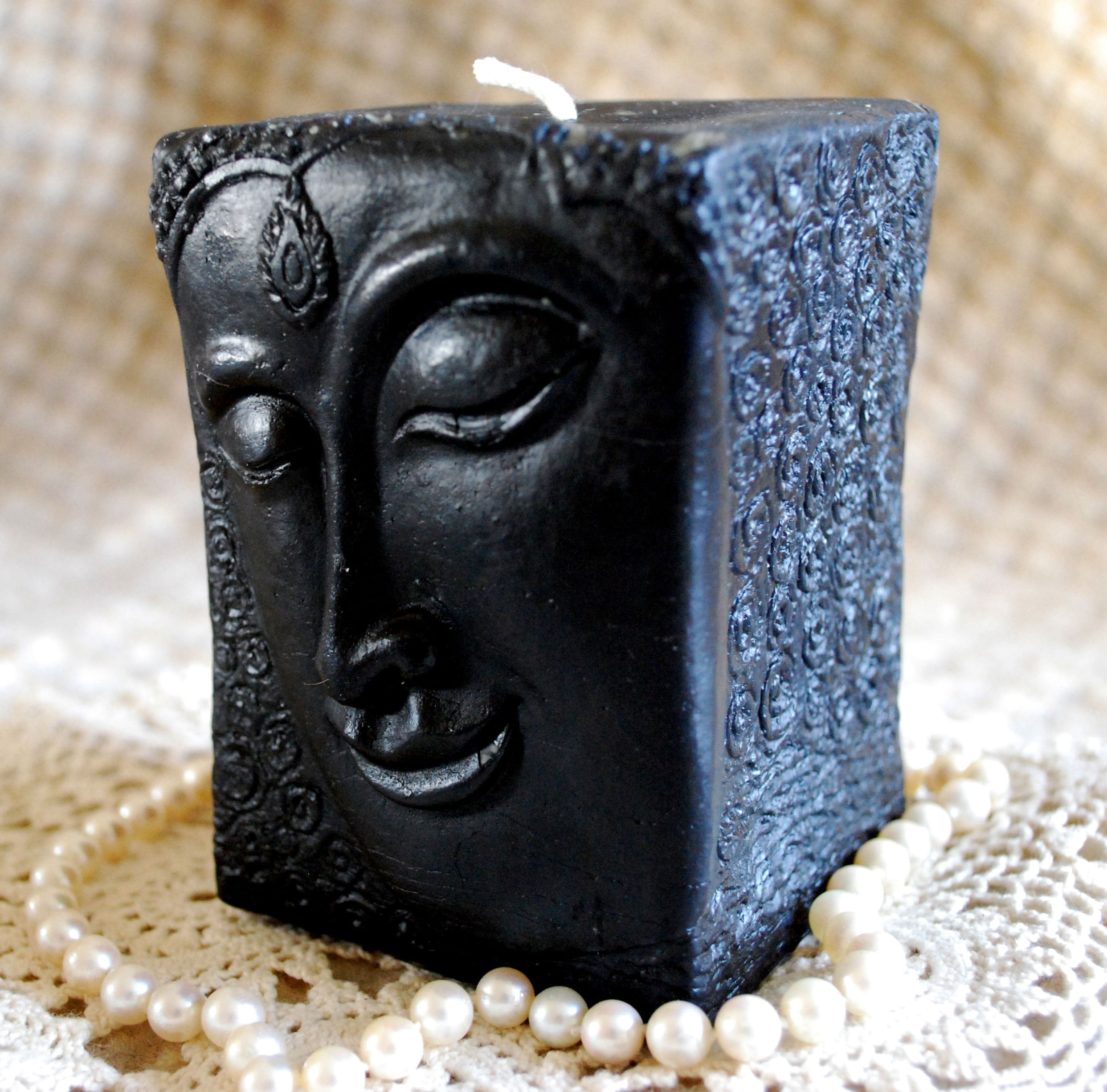 Square, substantial pillar measures 3″ by 4″ tall. Face of a dreamy introspective spiritual Buddha in soft relief featured on one side, the other sides are covered with scroll work. The dark wax really shows up the details. One of my favorites.