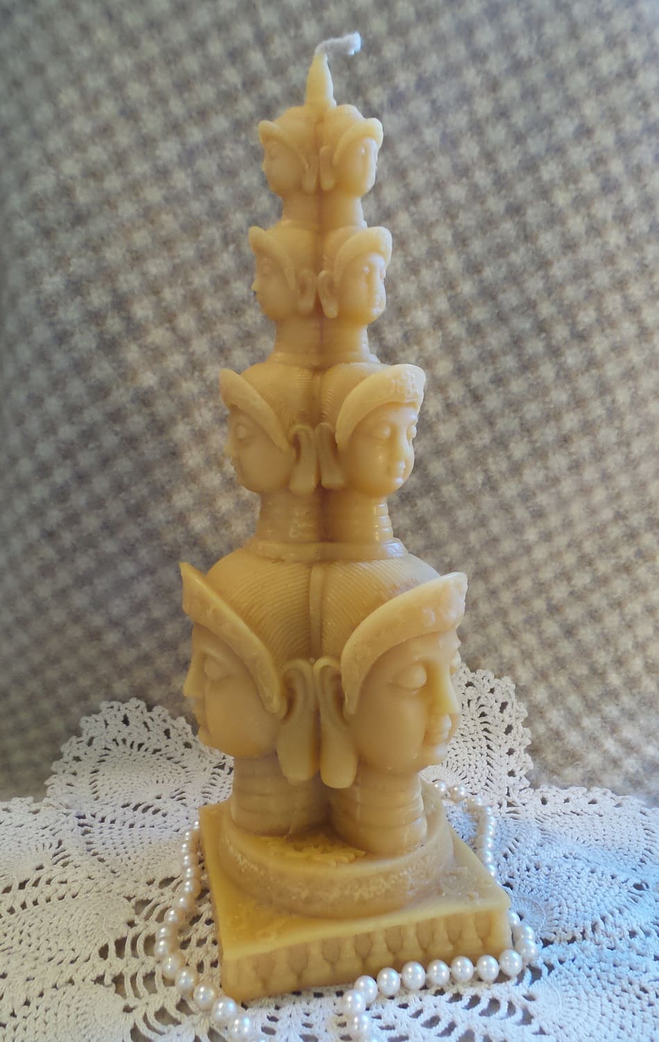 This candle is for those of you out there who are afraid to burn your beeswax candle for fear it will be “ruined,” as a new row of Buddhas are always there for you to enjoy! This is a truly spectacular candle, measuring 11 3/4″ tall and 3 3/4″ square at the base. The burn sequence starts out a bit faster, then slows, as the candle becomes bigger, the further down it burns. And like all my candles, this is made of fragrant Oregon beeswax and fitted with an all-cotton wick for non-toxic light. Do not miss this one! There is a slight postage upcharge to account for the larger box and careful packing required to avoid breakage in transport.
