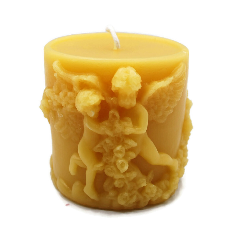 Detailed pillar with classic Rococo angel design measures 2 1/2″ x 2 3/4″ Elegant in any setting! Burn time, about 25-30 hours.