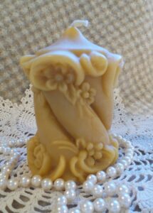 Unusual Swirl Floral design pillar from a German design. Measures 3″ x 4 1/4″ and weighs 10 oz. Smells wonderful in Pure Oregon beeswax and non-toxic to burn with an all-cotton wick. Burn time: about 40 hours.