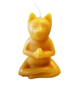 A Peaceblossom Candles original, this kitty sits in meditation. Perfect for the feline lover, yoga enthusiast, or meditator in your life! Measuring 1 3/4″ deep by 2 1/2″ wide and 3 3/4′ tall and weighing a little over 3 oz, this candle will unavoidably drip a little as it burns due to its asymmetrical shape. As with all candles, be sure to provide a suitable dish or holder while burning to prevent damage to surfaces. Available in natural golden beeswax.
