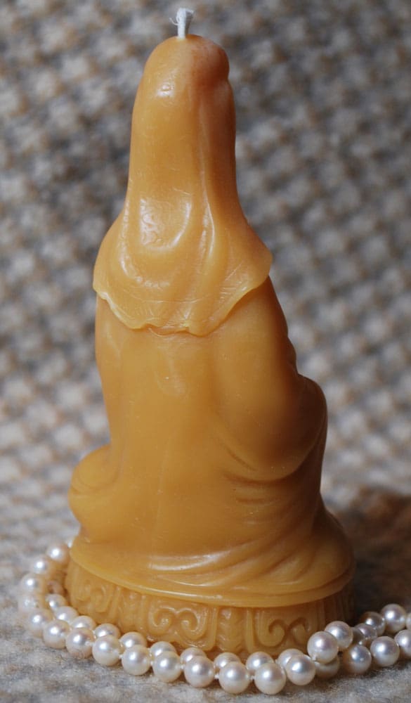 This beautifully detailed altar candle measures 2 3/4″ by 3 1/4″ at the base by 6″ tall. As it is an irregular figure it will drip and be deformed by burning, although if you do so be sure to place her on a dish or candle holder to protect your table.