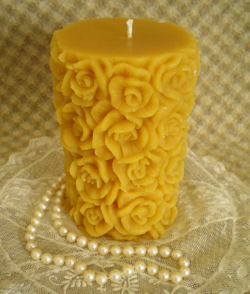 This highly detailed pillar is covered with detailed roses all around the candle. The top is plain. It measures a big 3 1/2″ diameter by 5 1/2″ tall and would make a lovely centerpiece or gift. This is a hefty candle! Pure natural beeswax and 100% cotton wick. Burn time: approximately 60-80+ hours. Thanks for looking and have a beautiful day!