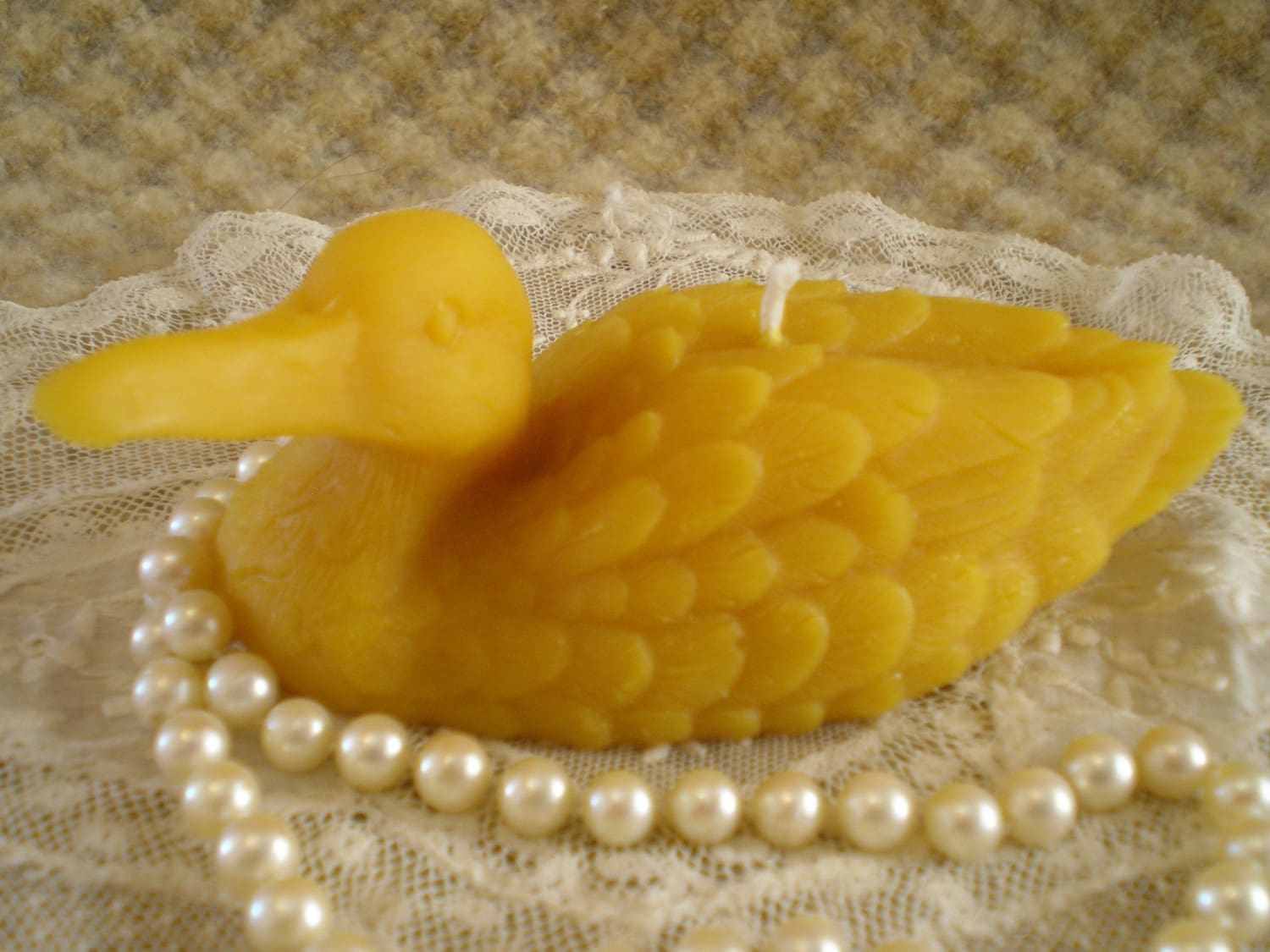 Detailed Duck Candle. Very cute! He measures 2″ wide by 4 1/2″ long by 2 1/4″ tall. Burn time: about 10 hours. Available in White or Natural pure beeswax. 100% cotton wick.