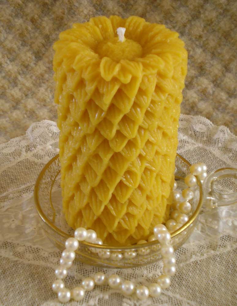 This highly detailed pillar measures 2 1/2″ diameter by 4 1/2″ tall It would make a lovely centerpiece or gift. The embossed outer surface looks really elegant as the candle burns, as the pattern is lit from within. Pure beeswax and 100% cotton wick. Burn time: Approximately 40 hours.
