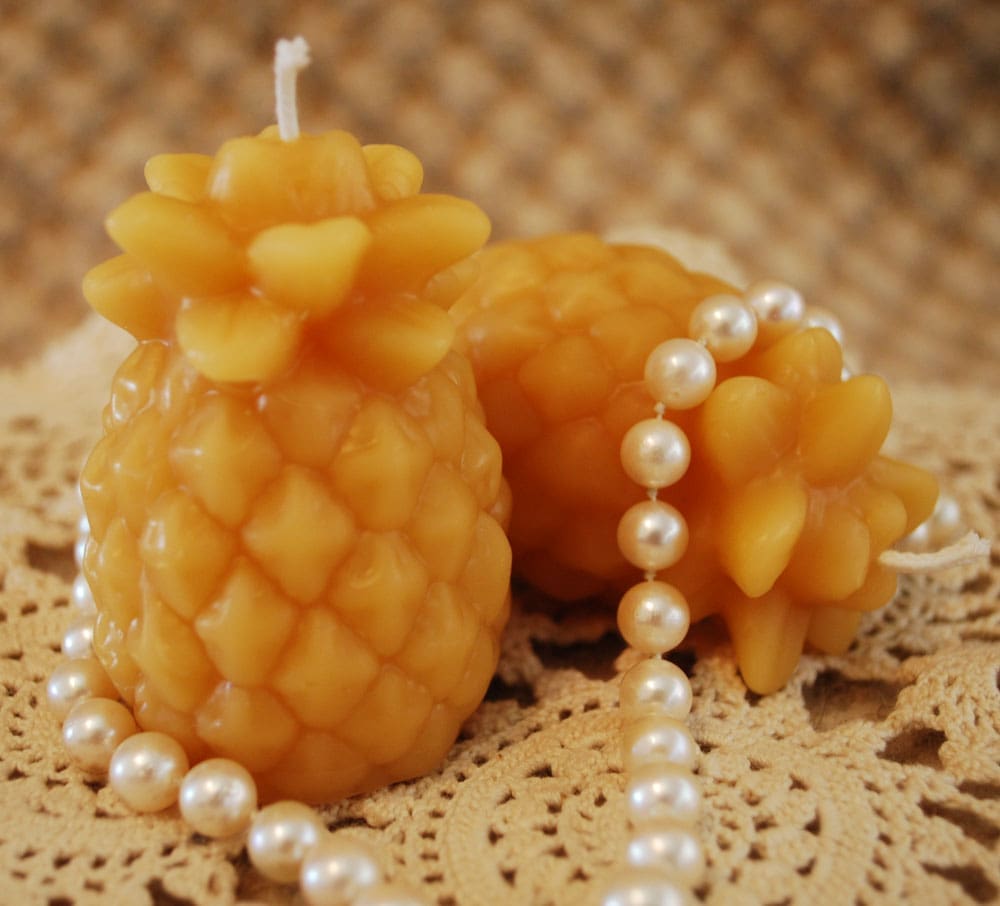 Adorable little pineapple candles measure 2 3/4″ tall by 1 3/4″ in diameter. These are a one-of-a-kind design you will not find anywhere else. Made of 100% pure beeswax and all cotton wick. You get two for the listed price.