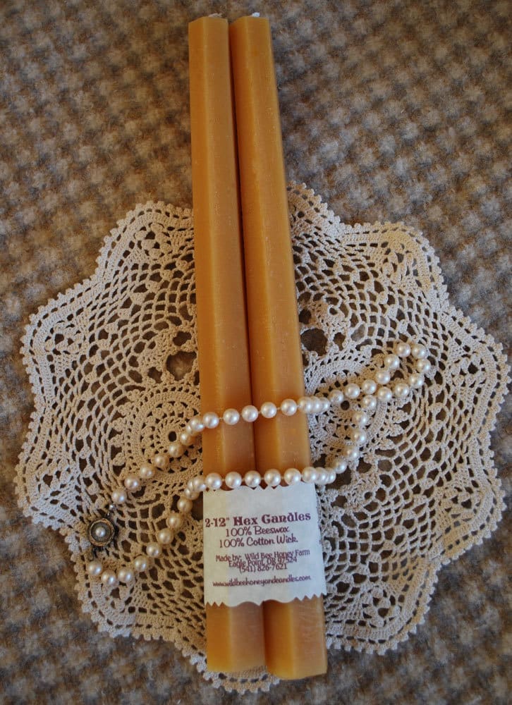 A pair of lovely tapers in a hexagonal cross-section (the same shape as the bees’ cells in the hive!) These are 12 inches tall and very dramatic. Someone rustic finish from the tin molds they were formed in. Made of wonderfully fragrant Oregon beeswax and 100% cotton wick for non-toxic light. Burn time: at least 15 hours.