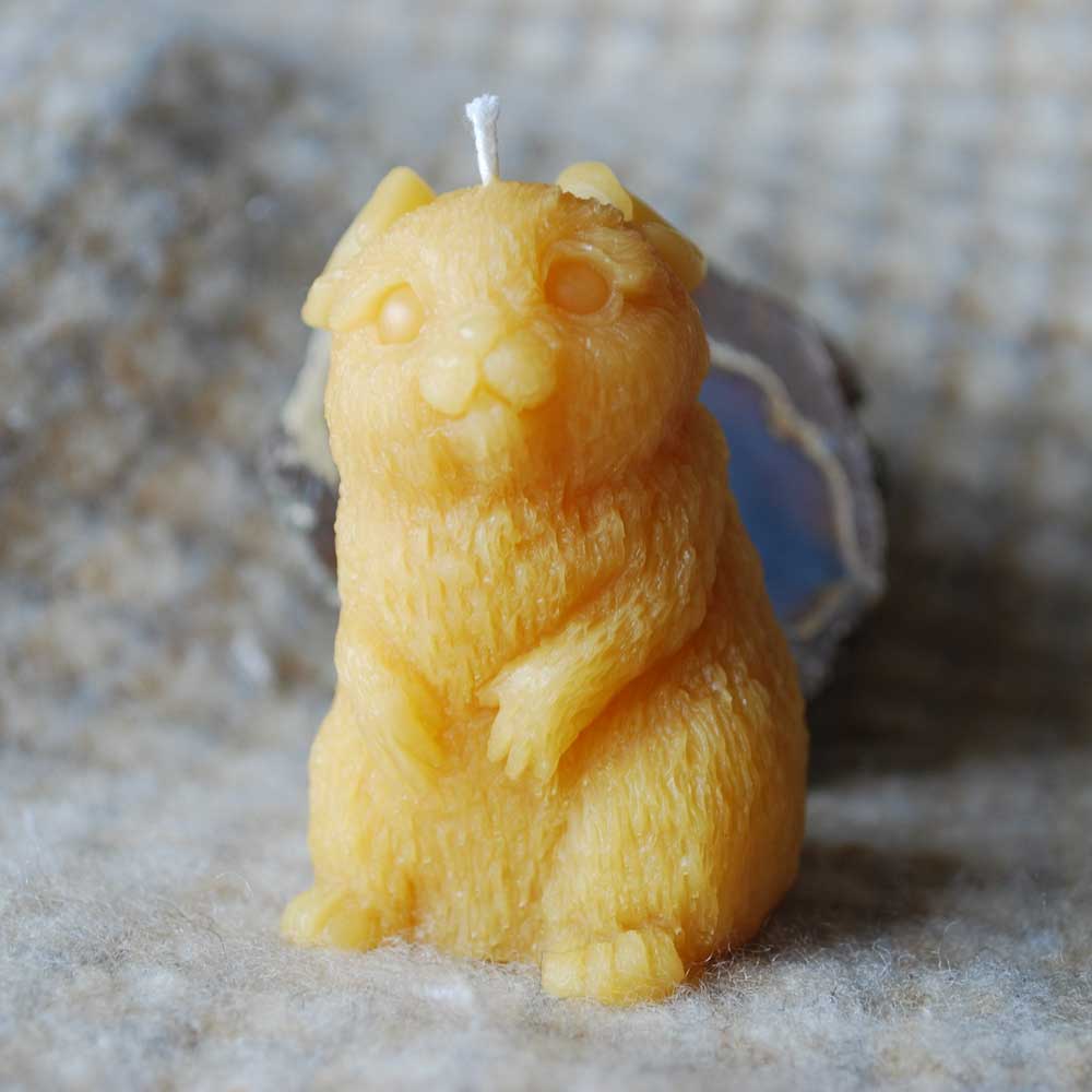 She measures 1 1/2″ wide by 2″ deep by 3″ tall, and like all my candles is made of pure beeswax with an all-cotton wick. Burn time about 6-7 hours.