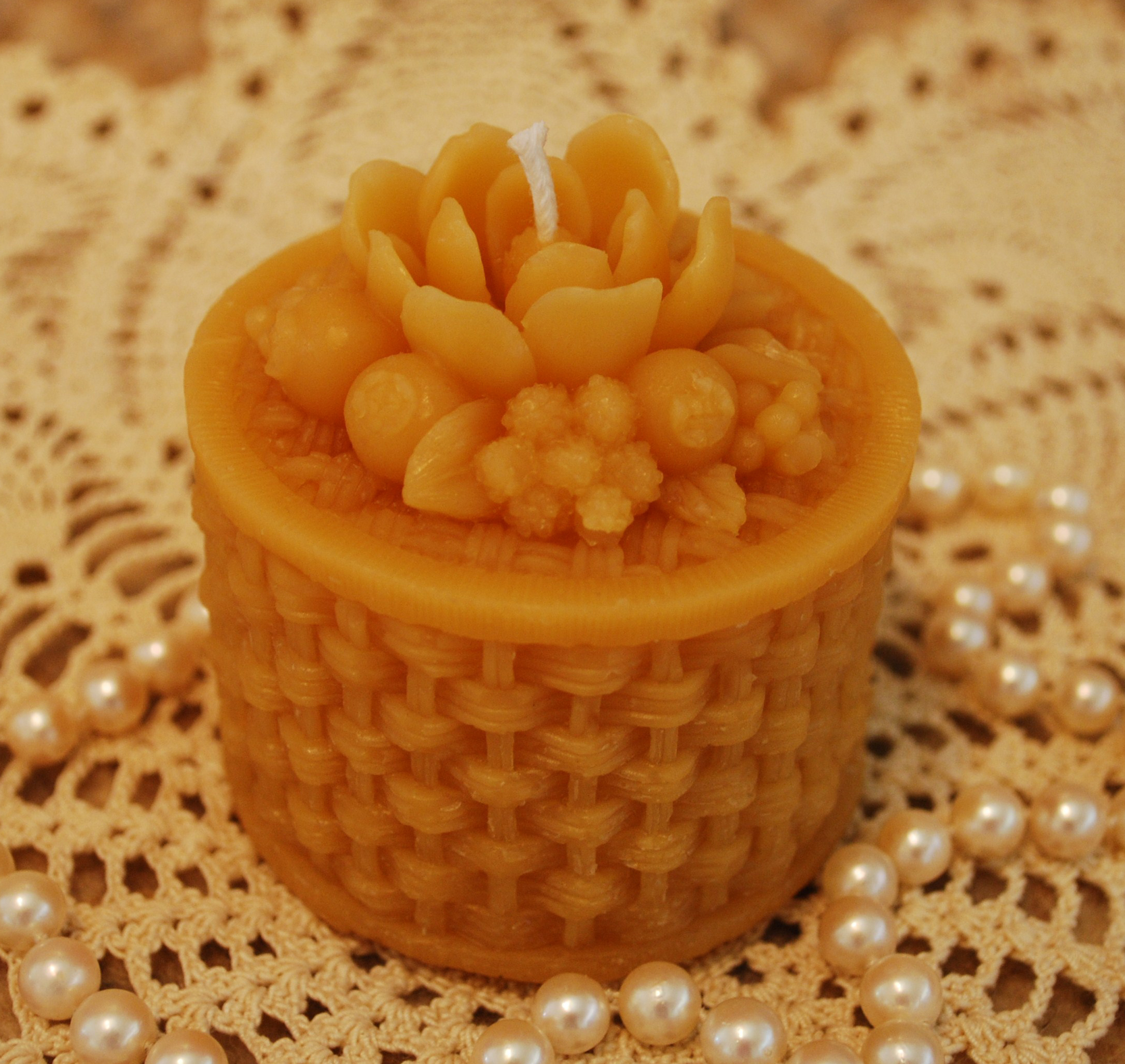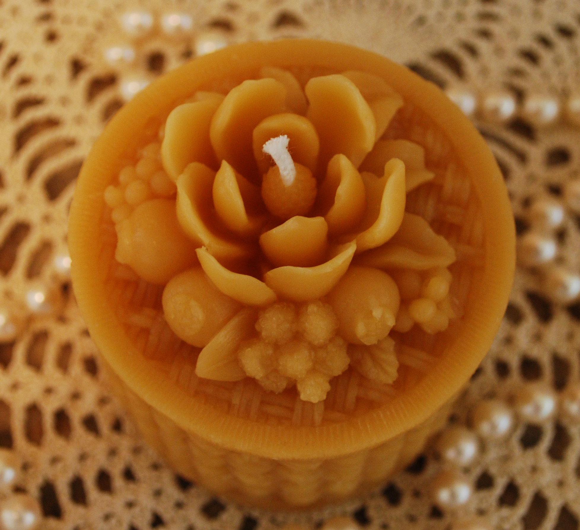 Pretty, very detailed beeswax candle featuring a woven-look basketweave pattern around the sides and crowned with a lush grouping of flowers on top. Very decorative and charming