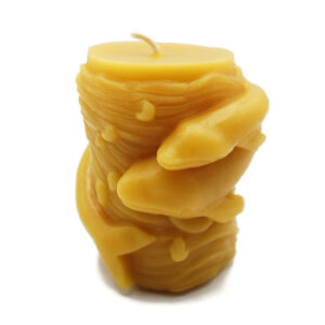 Softly molded Whale pillar measures 3 3/4″ tall by 2 1/2″, not including the whales which stand out in very high relief in a swirling pattern with lots of movement and makes the total diameter 3 -3/4″ Great for the whale watcher, seaside dweller or marine biologist in your life. Back side shows more whales in motion, including a mama and her calf. Very unique and rustic. Weight: 12 oz. And like all my candles, this pillar is made of pure Oregon beeswax and all-cotton wick. Burn time: about 35 hours+.